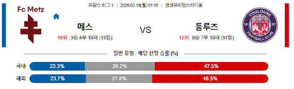 | 일반 승패 | 메스 패 (툴루즈 승) | ⭐⭐⭐⭐ | [강추] 툴루즈의 우수한 침투 전술 및 메스의 후반 수비 불안 |