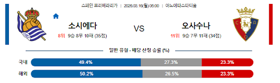 | 일반 승패 | 소시에다드 승리 | ⭐⭐⭐⭐ | [강추] 오사수나 핵심 2선 자원 결장 및 소시에다드 홈 강세 |