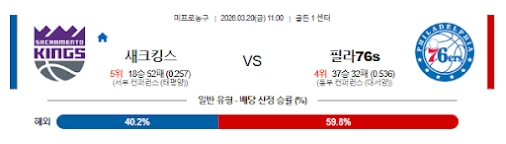| 핸디캡 | 새크라멘토 핸디 승 | ⭐⭐⭐⭐ | [추천] 필라델피아의 전반적인 에너지 레벨 저하 및 뎁스 부족 |