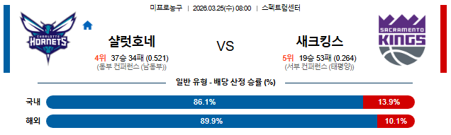 - [핸디캡] 새크라멘토의 원정 수비력을 감안할 때 10점 차 이상의 대승도 가능해 보입니다. 샬럿 마이너스 핸디 승이 유효합니다.