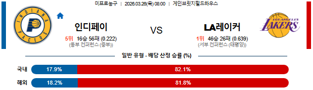 2026년 3월 26일(목) 오전, 인디애나폴리스의 게인브리지 필드하우스에서 펼쳐지는 동·서부 맞대결입니다. 구단 역사상 최다인 16연패를 극적으로 끊어낸 인디애나와, 아쉬운 패배로 9연승 행진이 멈춘 LA 레이커스가 만났습니다.