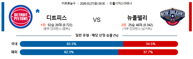 2026년 3월 27일(금) 펼쳐지는 NBA 정규시즌 매치업입니다. 동부의 신흥 강자로 떠오른 디트로이트와 서부의 복병 뉴올리언스가 맞붙습니다. 홈팀 디트로이트의 '백투백(연속경기)' 일정과 에이스의 부재, 그리고 뉴올리언스의 자이언 윌리엄슨을 제어할 대책을 중심으로 정밀 분석해 드립니다.