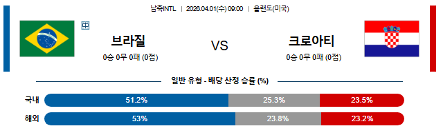 ⚽ [남축 INTL 분석] 4/1 09:00 브라질 vs 크로아티아: '흔들리는 삼바' vs '무패 행진' 크로아티아 [데일리 스포츠]