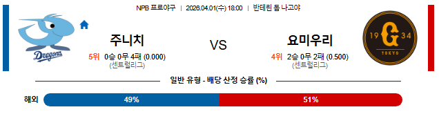 ⚾ [NPB 분석] 4/1 18:00 주니치 vs 요미우리: '4연패 늪' 주니치 vs '기세 오른' 요미우리 [데일리 스포츠]