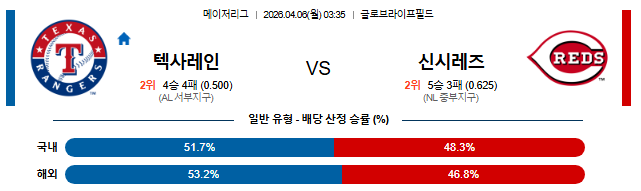 #데일리스포츠 #2026년4월6일 #MLB분석 #메이저리그 #텍사스레인저스 #신시내티레즈 #체이스번즈 #L잭 #야구추천 #적중가즈아 #MLB픽 #언더추천