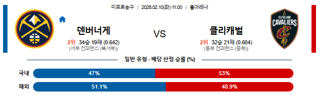 현재 덴버(34승 19패)는 서부 3위로 홈에서 극강의 효율을 보여주고 있으며, 클리블랜드(32승 21패)는 동부 4위로 3연승의 가파른 상승세를 타고 브라몰 레인이 아닌 볼 아레나 원정길에 오릅니다.